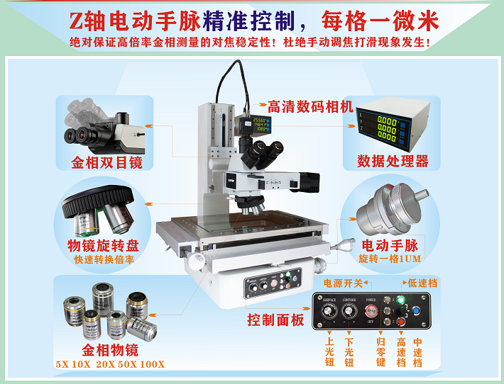 1. ◆本司最新推廣出的Z軸電動手脈金相測量顯微鏡,獨家使用專業(yè)訂制的高精準細分脈沖金相測量電機,通過設置多種脈沖細分量和機構上的精準調校,可以實現(xiàn)快中慢三檔調速來控制Z軸光學鏡頭上下移動;