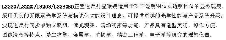 L3230/L3220/L3203/L3230BD正置透反射顯微鏡適用于對不透明物體或透明物體的顯微觀察。采用優(yōu)良的無限遠光學系統(tǒng)與模塊化功能設計理念、可提供卓越的光學性能與產(chǎn)品系統(tǒng)升級,實現(xiàn)透反射同步或獨立照明,偏光觀察、暗場觀察等功能,產(chǎn)品具有造型美觀,操作方便,圖像清晰等特點,是生物學、金屬學、礦物學、精密工程學、電子學等研究的理想儀器。