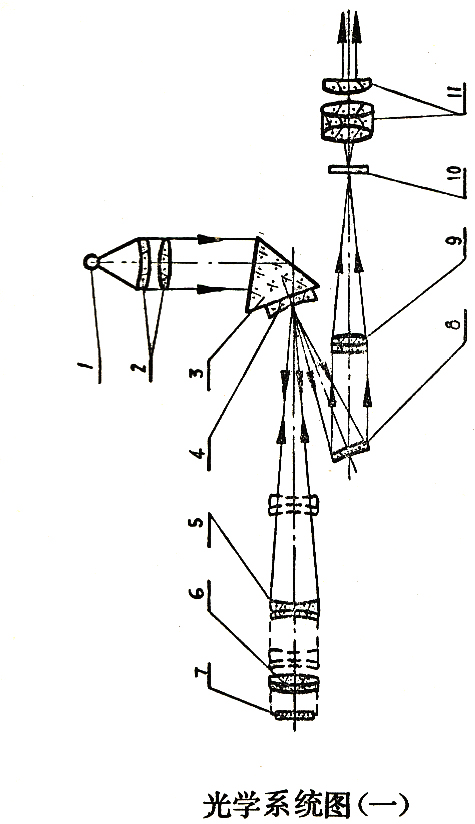 如圖一所示,由光源(1)發(fā)出的光束經(jīng)過聚光鏡(2)及反射棱鏡(3)均勻地照明球面反射鏡(4)球面反射鏡上鍍以鋁全反射膜并刻去十字形膜層,當(dāng)調(diào)焦物鏡(5)被調(diào)在無窮遠(yuǎn)位置時(shí),十字線洽好位于物鏡系統(tǒng)(5),(6)的焦平面上,因而,此時(shí)由十字線射出的光束通過物鏡系統(tǒng)后,以平行光束射出,光束被反射面(7)(欲測物)反射回來后又通過物鏡系統(tǒng)將十字線的象成在球面反射鏡的鍍鋁面上,通過平面反射鏡(8)及轉(zhuǎn)象。物鏡(9)在目鏡(11)的分劃板(10)上人們可以觀察到十字線及其反射射象的重合程度,偏離值可在測微目鏡的視場及測微鼓輪上讀出。調(diào)焦鏡(5)可前后移動(dòng),使不同距離的目標(biāo)成象于球面反射鏡上。